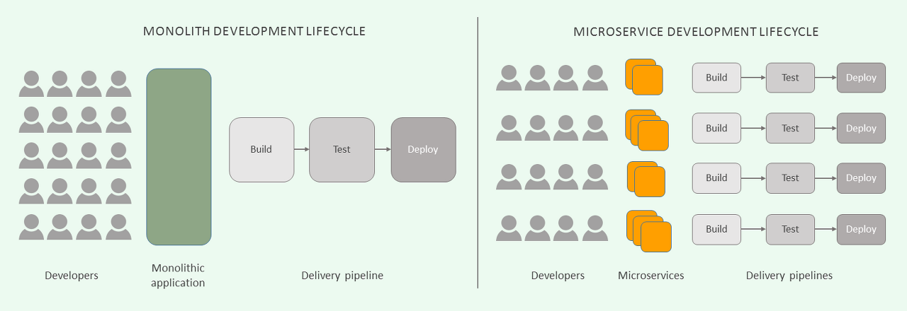 ** ์ผ์ชฝ์ ๋ชจ๋๋ฆฌ์(Monolithic), **์ค๋ฅธ์ชฝ์ ๋ง์ดํฌ๋ก ์๋น์ค(Micro Service)