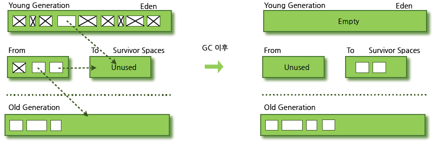 4. ํ๋์ Survivor ์์ญ์ด ๊ฐ๋ ์ฐจ๊ฒ ๋๋ฉด ๊ทธ ์ค์์ ์ด์๋จ์ ๊ฐ์ฒด๋ฅผ ๋ค๋ฅธ Survivor ์์ญ์ผ๋ก ์ด๋ํ๋ค. ๊ทธ๋ฆฌ๊ณ ๊ฐ๋ ์ฐฌ Survivor ์์ญ์ ์๋ฌด ๋ฐ์ดํฐ๋ ์๋ ์ํ๋ก ๋จ